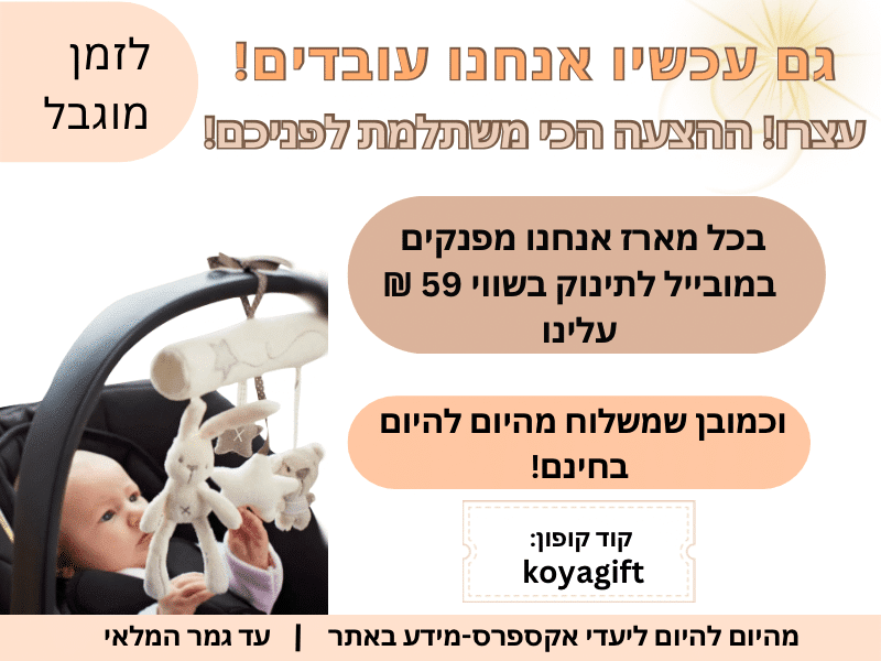 שימו לב משלוח שיעשה ביום חמישי לאחר השעה 10:50 בבוקר יגיע ביום ראשון. אם ישנה דחיפות למשלוח מהיר בימי שישי וערבי חג צרו עימנו קשר ונמצא לכם פתרון!