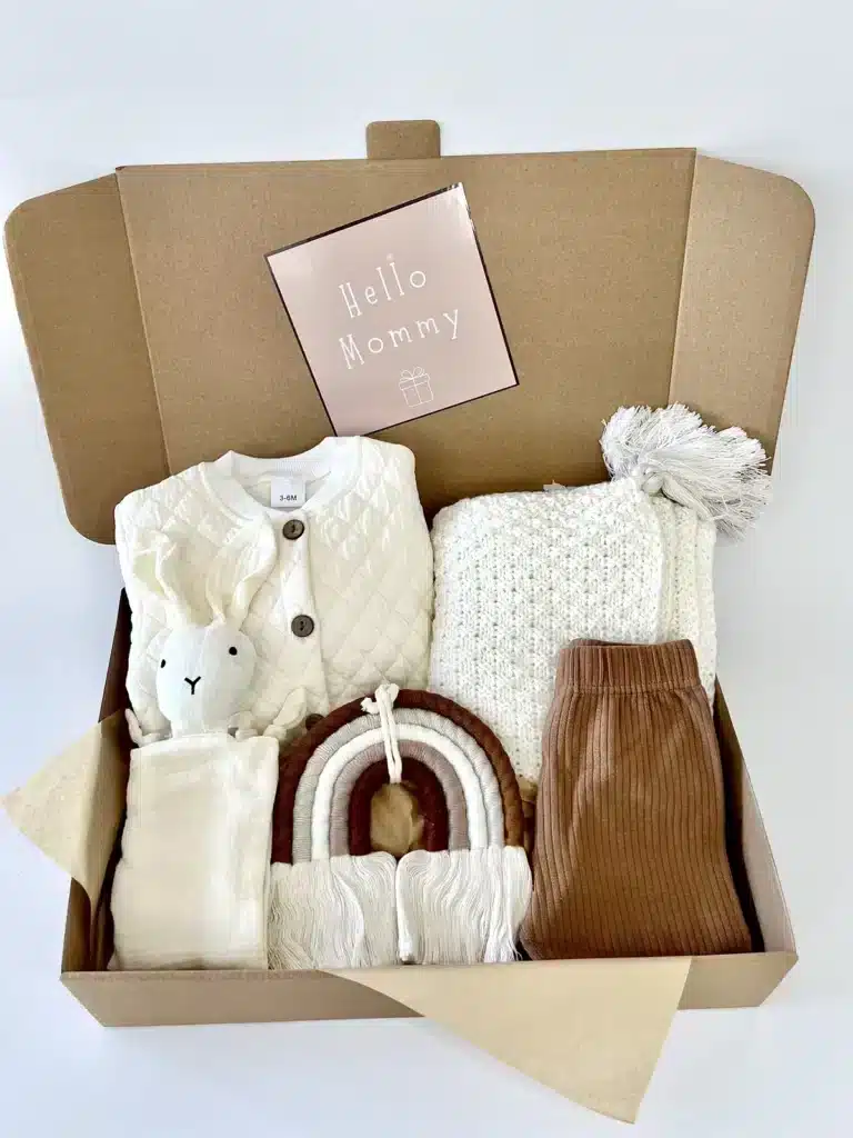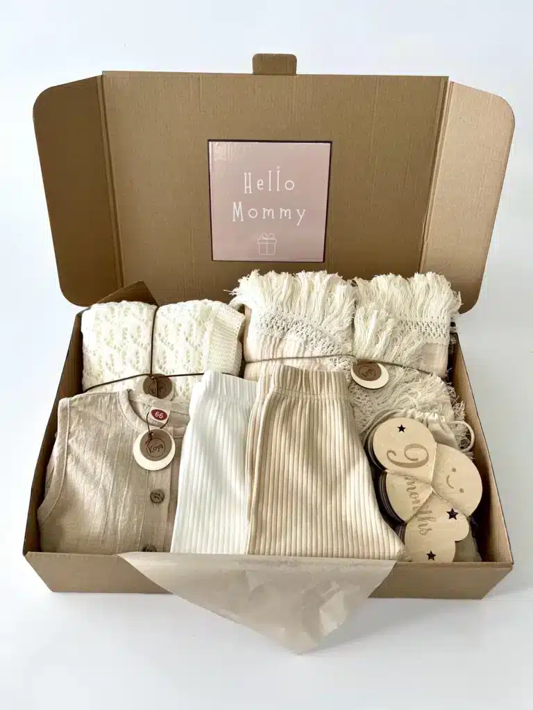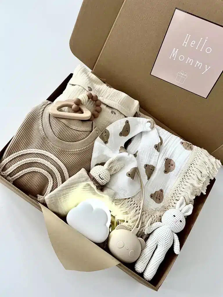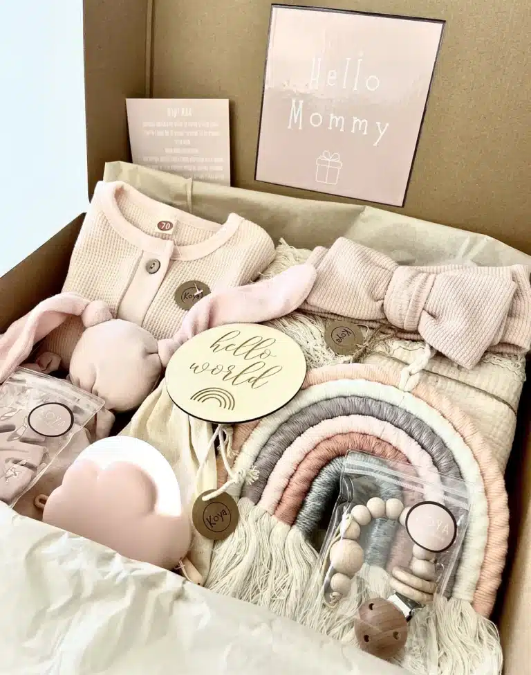 מארז לידה שופע במוצרים בגווני יוניסקס רכים ונעימים שיכבוש את לבביכם