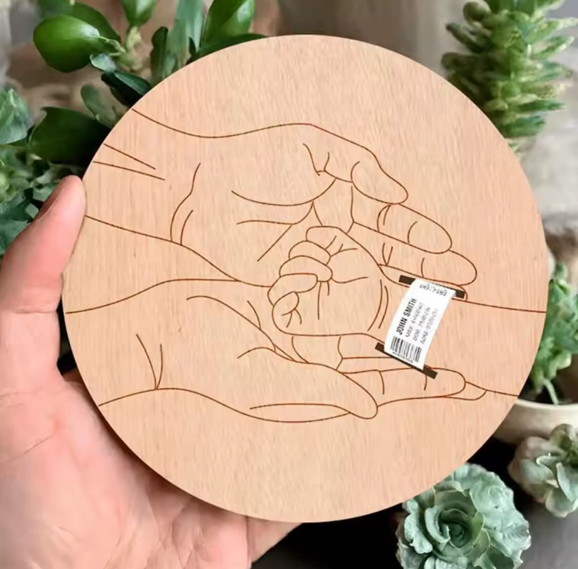 דיסקית עץ לשמירת צמידי הלידה מעץ טבעי, עם חריטה עדינה המדמה ידיים, בהן ניתן להשחיל את צמיד התינוק